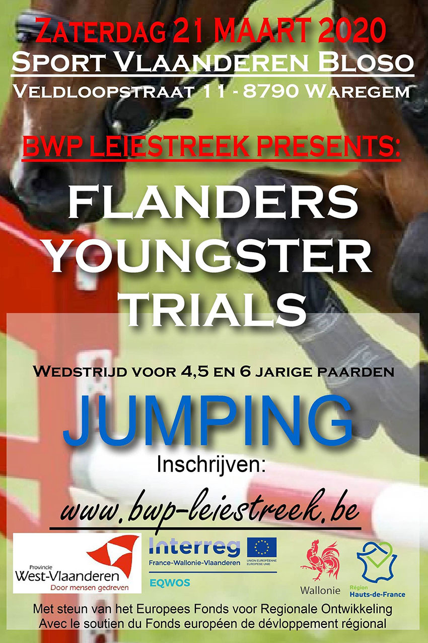 Waregem - Flanders Youngster TrialsWestrijd voor 4, 5 en 6 jarige paarden21 maart 2020Info & inschrijven : www.bwp-leiestreek.be Afbeelding